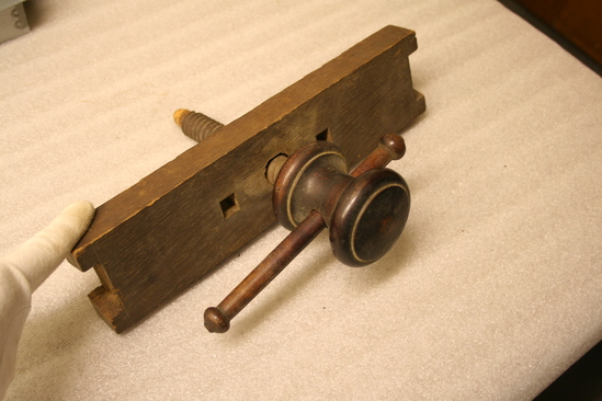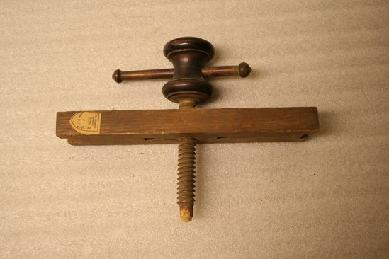 Wooden block press. Rectangular piece of wood with wooden rod through center. Top of rod has polished wooden handle. Through center of handle (parallel to rectangular block of wood) is a smaller rod of wood. This allows handle to be turned and move the rod up and down through the center of the block of wood. There should be a second block of wood on the rod but it is missing