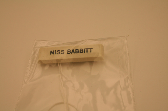 American Red Cross name tag. White plastic rectangle with beveled edge on all four sides. In center of name tag, impressed into plastic "Miss Babbitt" with pin closure on back.