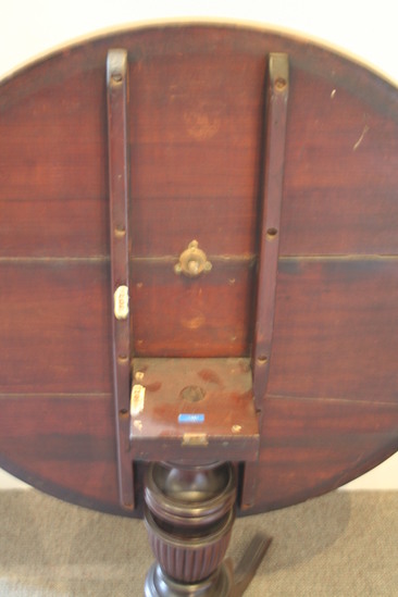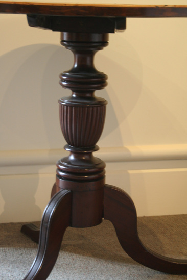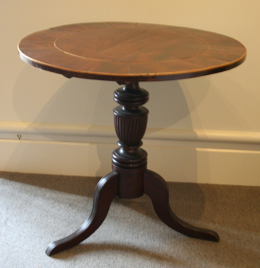 Tilt top table, turned pedestal base with three scrolled cabriole legs. Top of table has mahogany veneer. Circle on surface of top with border of segmented crotch veneer and light wood string bands at edge. Note glued to bottom of table (now removed and in accession file) "The Beecher Table/Made by Mr. Ralph P. Smith, Litchfield/The wood of the top is from a part of/the Pulpit in the former Congregational/Church, Litchfield, Conn./Presented to the/Litchfield Historical Society/by Mrs. J. Deming Perkins/--1907"