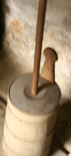 Butter churn in three parts - churn, cover and dasher. All wooden. Churn has four metal hoops at regular intervals along circumference of body.