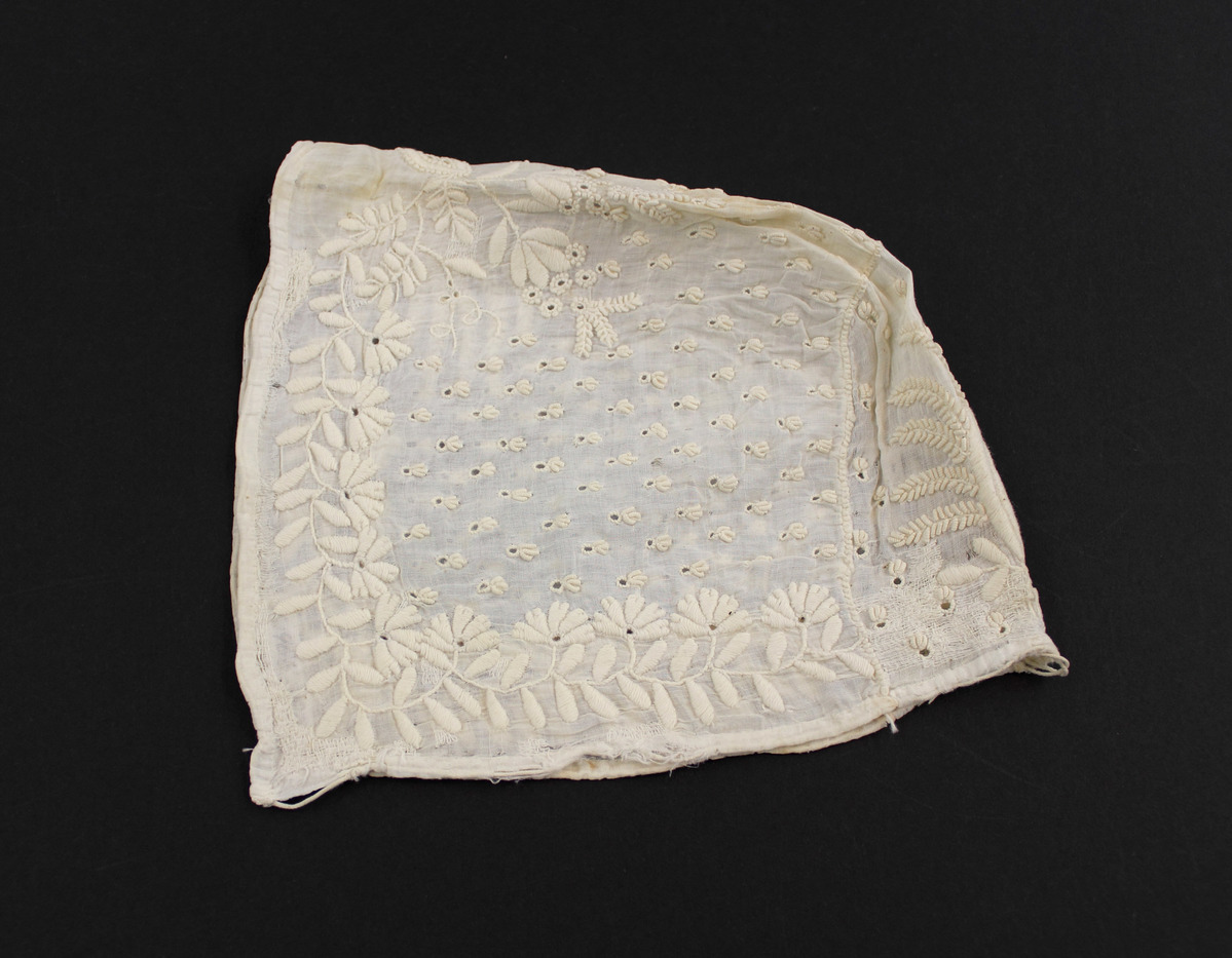 Off-white sheer cotton child's bonnet; overall floral embroidery; drawstrings at center back