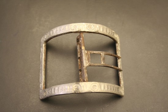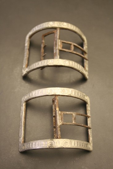 Pair of shoe buckles. Rectangular shape with pronounced rounded body. Repeating design on front of buckle - created by forming buckle in a mold. Center rod with two pronged pieces - one with two pronounced spikes and the other rectangular shape with two small spikes.