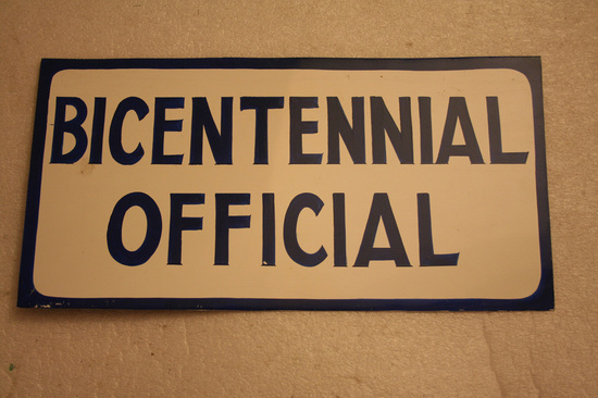 Rectangular metal sign. Paintec blue on back. On front blue border with white area in center. Blue lettering "BICENTENNIAL/OFFICIAL"