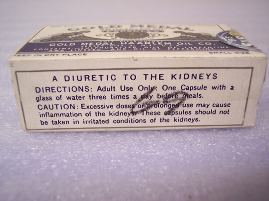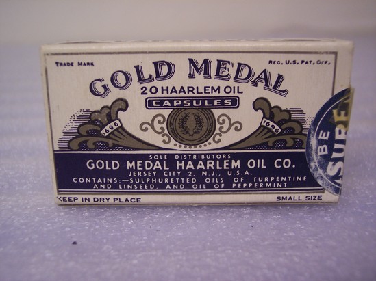 Dark blye, gray on white printed cardboard box of "Gold Medal Haarlem Oil Capsules" distributed by the Gold Medal Haarlem Oil Co. of Jersey City, NJ. A diuretic for the kidneys