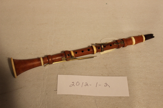 A wooden clarinet, made by Asa Hopkins, made in four section with ivory rings at each join and at the base of the clarinet. The mouthpiece is of a dark wood with rows of horizontal incised lines. There are seven holes and seven brass keys. The joints are wrapped in thread for traction, Stamped, "LITCHFIELD, CONN" at top below mouthpiece and "ASA HOPKINS/LITCHFIELD/CONN" at bottom above bell end.