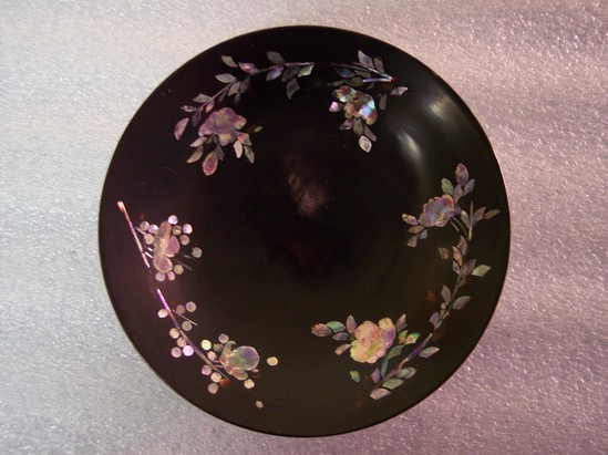 White porcelain covered with black, cold-painted enamel. Mother-of-pearl floral designs. White interior.