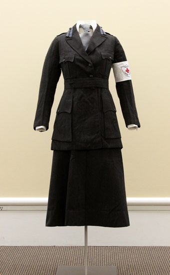 This collar was worn by Anna Lansing with her Red Cross uniform during her time of service during World War I. Born in 1871, Anna Lansing served in the American Red Cross Canteen Service during WWI. With the American entry into the war, transportation difficulties and congestion at important railroad junctions often made it impossible for soldiers to receive adequate meals prior to boarding and disembarking. The United States government requested the American Red Cross provide refreshments at railroad junctions, both at home and abroad, for the military on troop trains. As a result, the canteen service was founded and it grew quickly in both the United States and Europe to serve Allied troops from the U.S., France, Italy, and Great Britain. By the end of the war, the Red Cross was operating 700 fixed canteens and served refreshments to nearly 40 million members of the armed forces. The canteen service distributed 1.5 million gallons of coffee, 15 million sandwiches, and 11 million cookies, doughnuts, and pies. This work was only accomplished due to the sheer number of women who found time away from their home, children, and wartime jobs to volunteer. In total some 55,000 women volunteered with the Red Cross during the First World War.