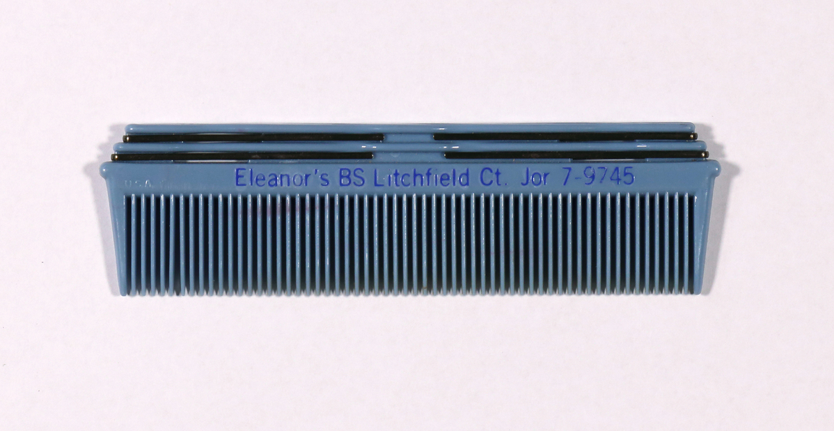 Blue plastic comb produced for a beauty salon in Litchfield, Connecticut. Short comb with fairly fine teeth. Marked on one side in raised lettering, "Eleanor's BS Litchfield Ct. Jor 7-9745." Along top of comb, two sets of metal bobby pins inserted into horizontal grooves.