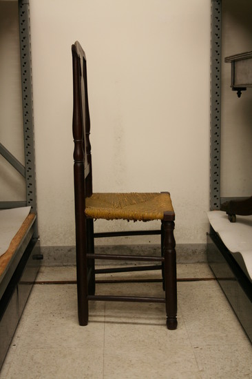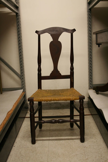 Fiddleback side chair with rush seat. Round front legs, slightly turned. Turned front stretcher - tulip and hollow ring pattern. Pair of stretchers on side and one in back - all plain. Flare earred yoke, vase shaped back splat. Simple turned side rails. Chairs painted/grained like mahogany. One of a seat of three.