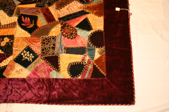 Wide border of maroon velvet. Center/body of quilt comprised of crazy patches of silk and velvet, many embroidered with flowers or small figures. All appliqueed flowers of grosgrain ribbon or velvet. Binding is three pieces of fabric twisted together like rope. Burgandy silk backing with hand knots throughout.