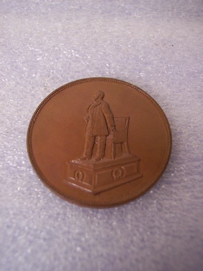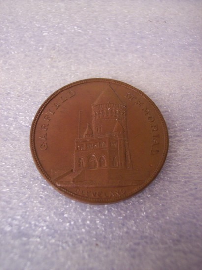 Round bronze medal with smooth rim and tooth edged. Front side depicts standing statue of President James Garfield in front of chair on a pediment. Back side has picture of Garfield Memorial Building in Cleveland, inscription above "GARFIELD MEMORIAL" and below "CLEVELAND"