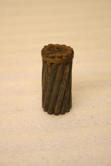 Section of the Matanzas, Cuba Atlantic Cable cut by the crew of the "Wilmington" and given to E.H. Foley during the Spanish American War. Body has one round brass collars on cable at one end. Exterior of cable is twisted iron strands with insides concentric layers of copper and iron strands.