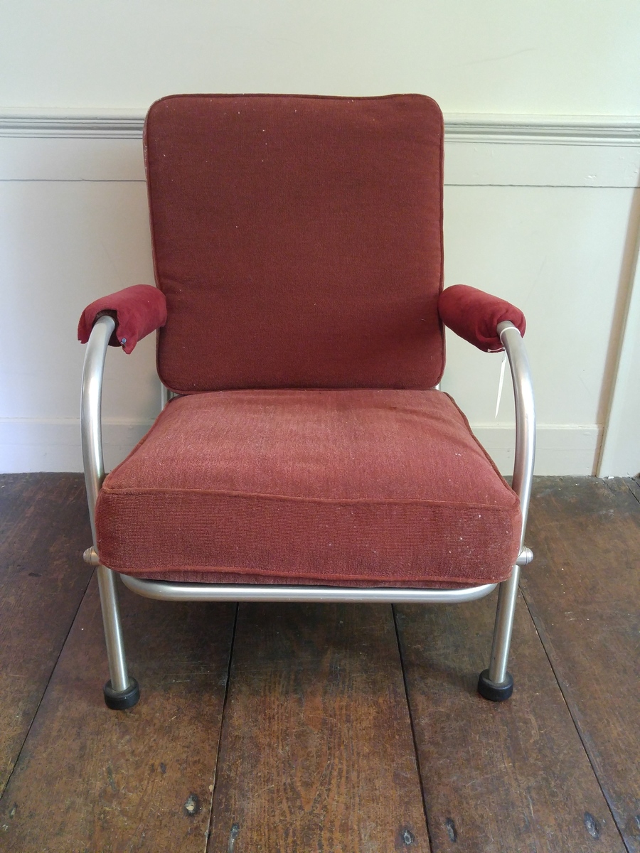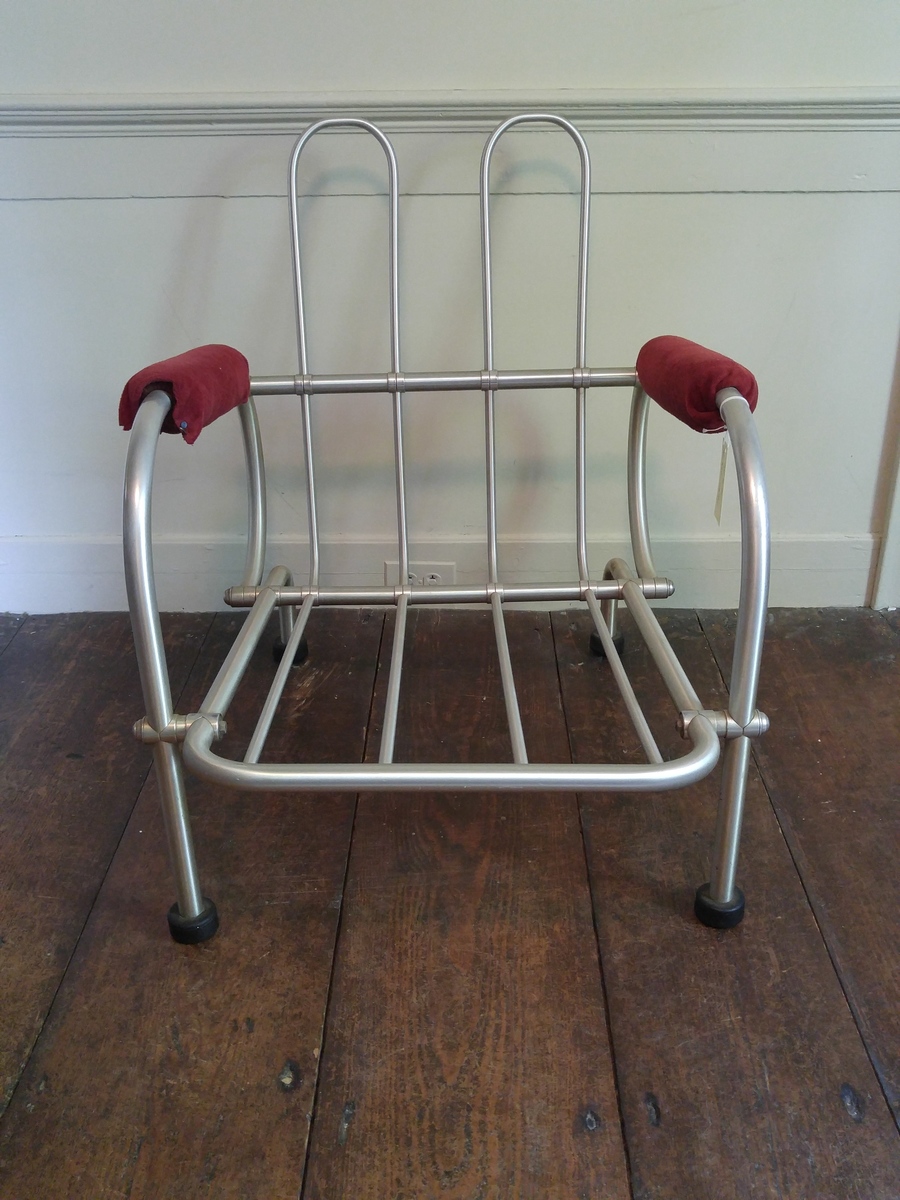 Aluminum frame lounge chair made by the Warren McArthur Corporation. A - Anodized aluminum frame formed by tubular members joined with aluminum rings. Raised on four legs supported by rubber disc pads. Circular armrests with square seat and seat back. Armrests have been reupholstered in a red fabric, while the seat and seat back remain upholstered in the original orange/rust fabric. The front legs continue up to form the arms and join with the support rail for the seat back, before curving downwards and joining with the side seat rails. The back legs are formed by a continuous piece of tubular aluminum that also forms the side and front seat rails, and joins with the front legs and the back seat rail. The seat frame is formed by two sections of continuous aluminum tubing, each starting at the front seat rail, traveling along the base of the seat to the back seat rail, and continuing up the seat back before curving downwards and returning to the front seat rail (similar construction to settee, 2016-36-5). B - Bottom cushion, upholstered in original orange/rust fabric. C - Back cushion, upholstered in original orange/rust fabric.