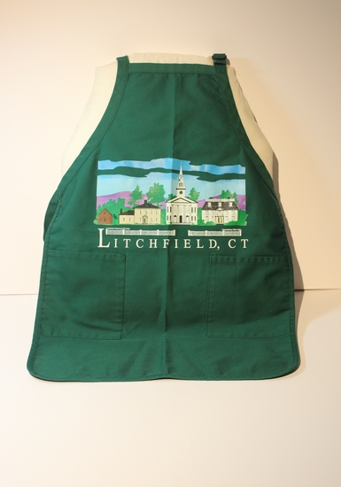 Cotton and polyester apron. Green with two pockets on front with waist ties and adjustable neck strap. Image of four buildings printed on front with a white picket fence below. "LITCHFIELD, CT" printed in white letter below image.