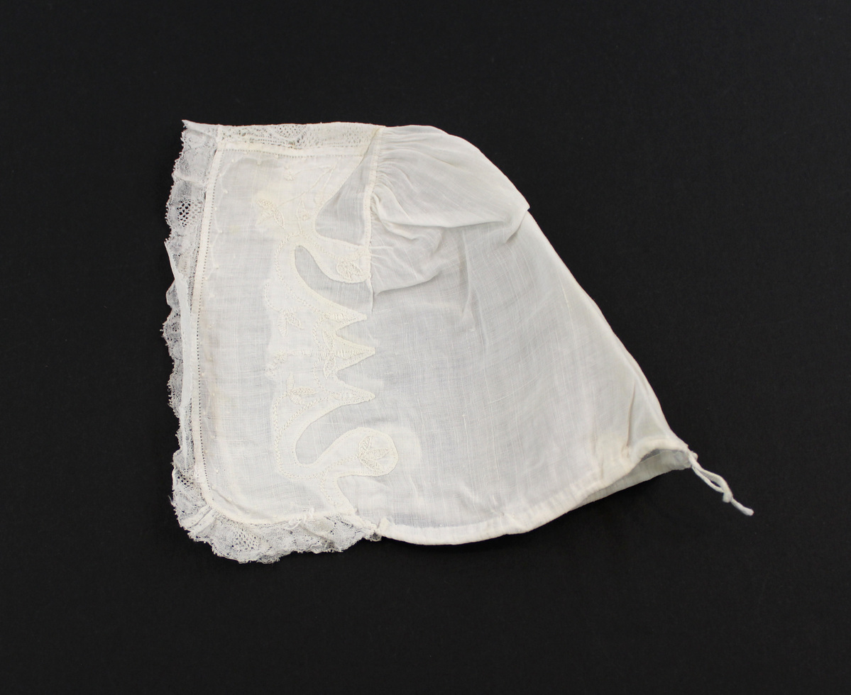 Off-white sheer linen child's bonnet; lace at front; embroidered appliques and lace insertion at front; drawstrings at center back