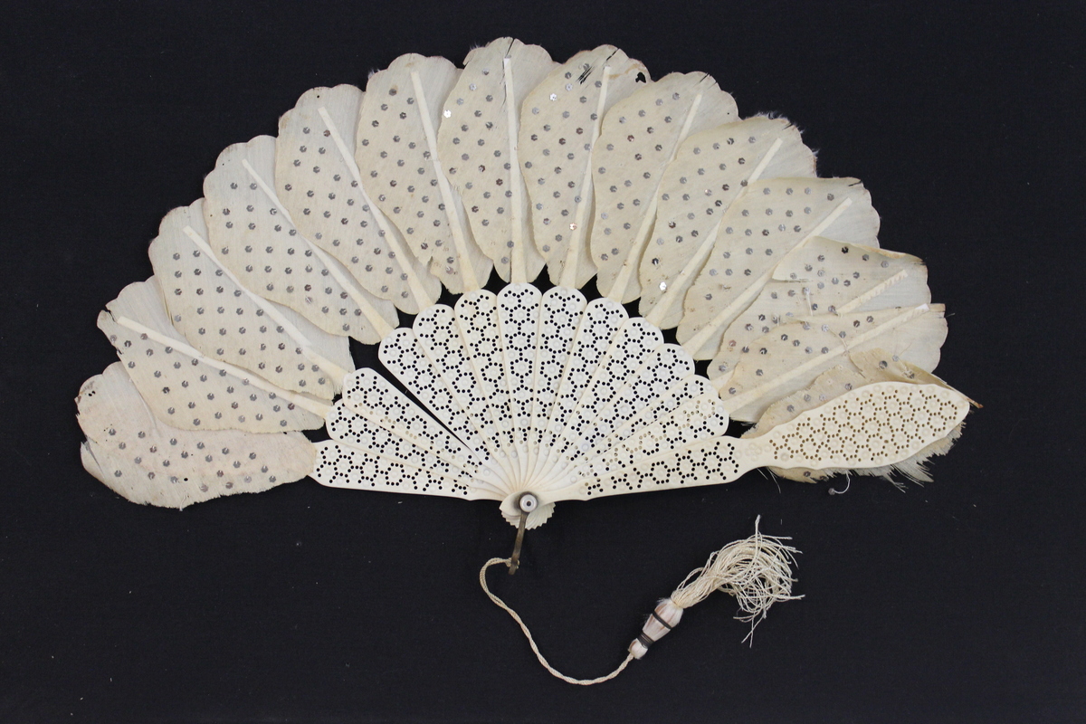 Hand fan with pierced ivory sticks and silk feathers. Each stick is comprised of a 3" lower section with molded circular designs surrounded by hexagonal shapes of pierced decoration. The sticks narrow at the bottom where they are joined by a mother of pearl button and metal handle with silk cord and tassel. Above the decorated section, the sticks form a narrow 3.5" strip to which are attached individual pieces of cream silk, decorated on the left with small silver floral sequins. Each sequin is sewn onto the silk, and the silk pieces are joined by cream thread. The first and last sticks have wider top sections with the same pierced design as the bottoms.