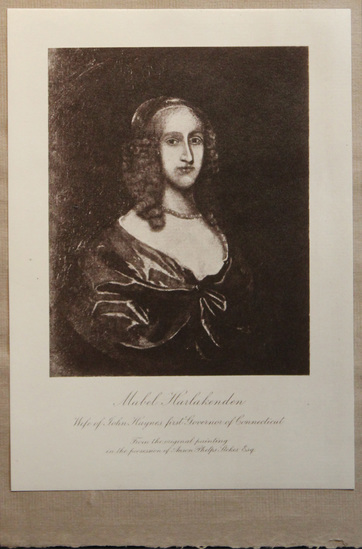 Black and white print of a woman from the waist up facing left. "Mabel Harlakenden/ Wife of John Haynes first Governor of Connecticut/ From the original painting/ in the possession of Anson Phelps Stokes, Esq" printed below portrait. Print mounted on a thick piece of beige colored paper.