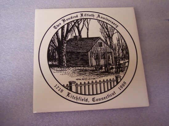 Square white ceramic tile with glaze, cork backing and paper metal hanger. Front design; double circle with "Two Hundred Fiftieth Anniversary/1719 Litchfield Connecticut 1969" on it. Inside circle is drawing of Tapping Reeve's Law School with said legend, view over fence from south of school through old garden without leaves on trees.