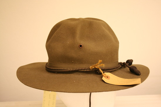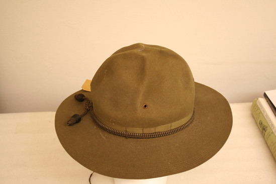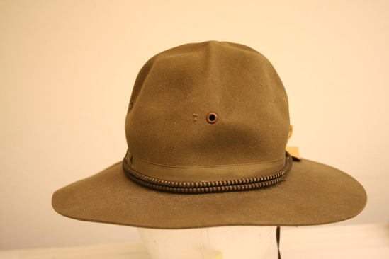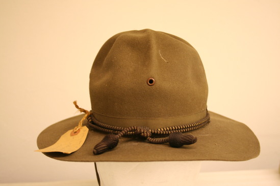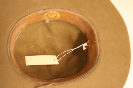 World War I era campaign hat. Olive green/brown felt hat with tall rounded crown and 3" wide flat brim all the way around; green grosgrain ribbon wrapped around base of crown as well as two black and gold striped cords; knotted in back with covered toggles at ends of chord; no lining on inside, but brown leather band; a thin green ribbon attached to middle of sides - broken off on one side; on band in gold "Brooks Brothers Madison Ave. Cor. 44th St. N.Y." and stamped on band "John B. Stetson No. 1 Quality."