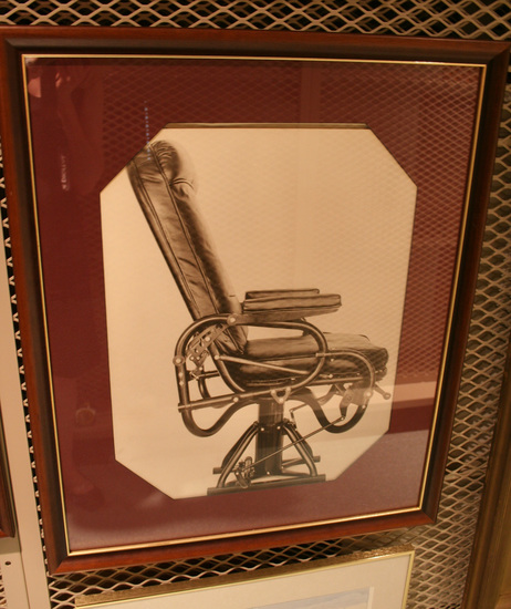 Vertical black and white photograph of the side view of an airplane seat. Framed under glass with a maroon mat board and wooden frame with a gold line on interior edge.