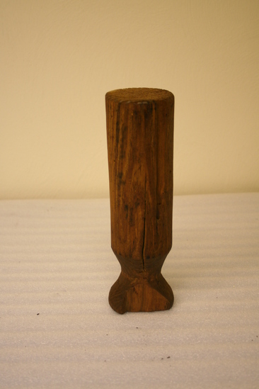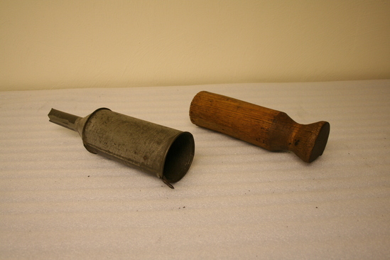 Tin tube with funnel-shaped spout has rolled rim. Has been mended/soldered at seams. Small tin loop for hanging. Round, blunt wooden piece fits inside tin tube to push sausage ingredients throught spout. Wooden piece round with handle sloping in and then flaring out again.