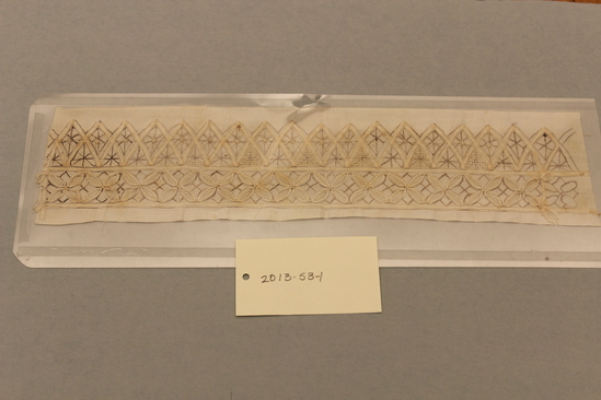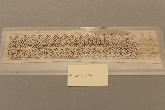 Rectangular piece of ivory parchment with a waxy finish. Honiton lace border pattern with overlapping triangles and quatrefoils drawn in black ink on one side. On hte reverse the lace has been worked in ivory cotton thread. The lace is unfinished.