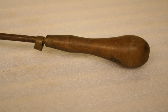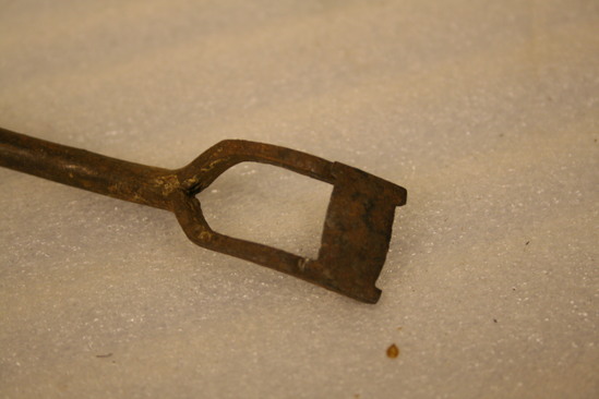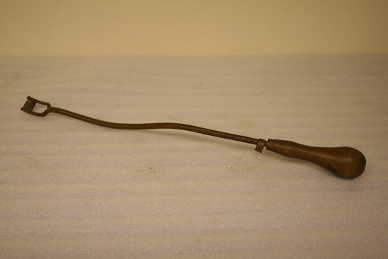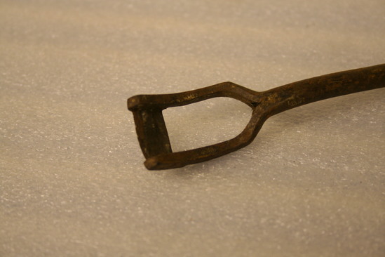 Cobbler's tool; short, bulbous wooden handle with brass cap on top. Wood has swelled and splot so brass cap no longer fits. Long iron neck; thin and round, curves in several places; top of neck ends in a U shape; between U is a thin metal blade