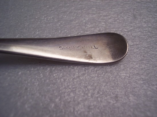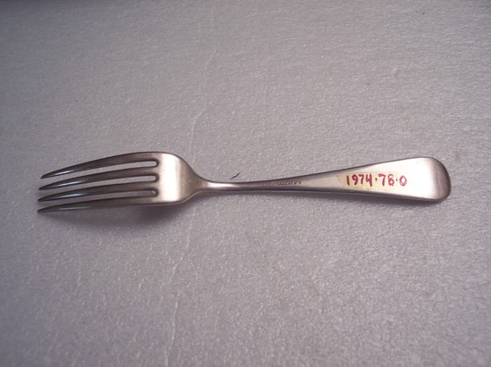 Silver fork, 4 tines, rounded end with flat handle. Hallmark on back of fork "1335 Wallace 9"