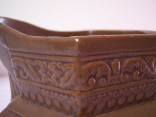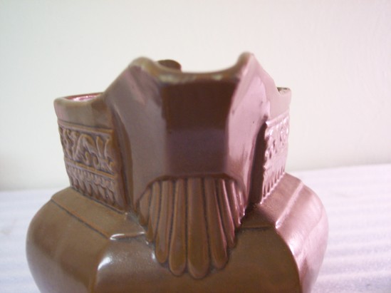 Brown, glazed hexagonal pitcher with flared body and high collar with two bands of impressed decoration. Flared spout with palmate design underneath and a flared segmented handle. Pitcher is said to be a copy of one belonging to Benjamin Franklin.