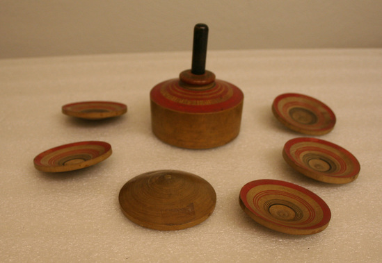 The top is made of natural wood with vermillion colored decorations. The inside of top is hallowed out and six concave wooden discs with pointed bottoms fit inside. On top is a turned button in which the cord was wound. A black handle on top enables spinner to hold top. When top set on floor the six discs emerge and spin.
