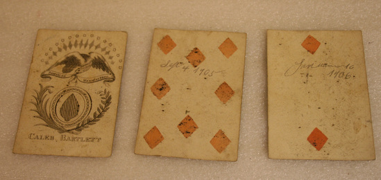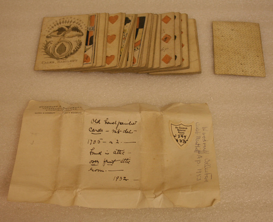 All 52 cards have back with a printed design of small greenish-blue dots. The Ace of Spades is engraved and handpainted while all the others were done with wood blocks. The Kings, Queens, and Jacks of each suit are single figures done in red, blue, yellow, and black. Cards are held together wrapped in white paper with ink description on outside.