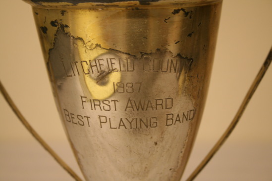 Trophy or Loving Cup, base metal with gilt wash, interior intact, flaked off outside, traditional loving cup shape urn forn with base and handles, Engraved on front: "LITCHFIELD COUNTY / 1937 / FIRST AWARD / BEST PLAYING BAND" Was on view at the Litchfield High School until 1996 gift