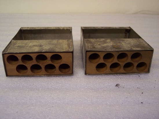 Two metal boxes. Bottom half of each box hollow with short lip on bottom. Top half of box has wooden insert with 8 holes in top. Holes were for holding paper cartrdiges.