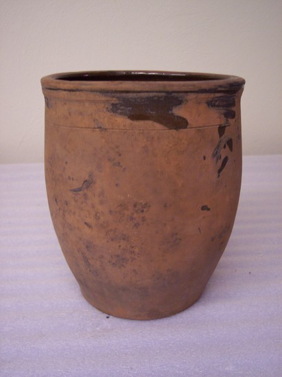 DARK BROWN GLAZE ON INTERIOR, UNGLAZED EXTERIOR. INCISED LINES (2) BELOW ROLLED RIM. WIDE MOUTH SLOPES TO CURVED SIDES, SLOPE TO PLAIN BASE.