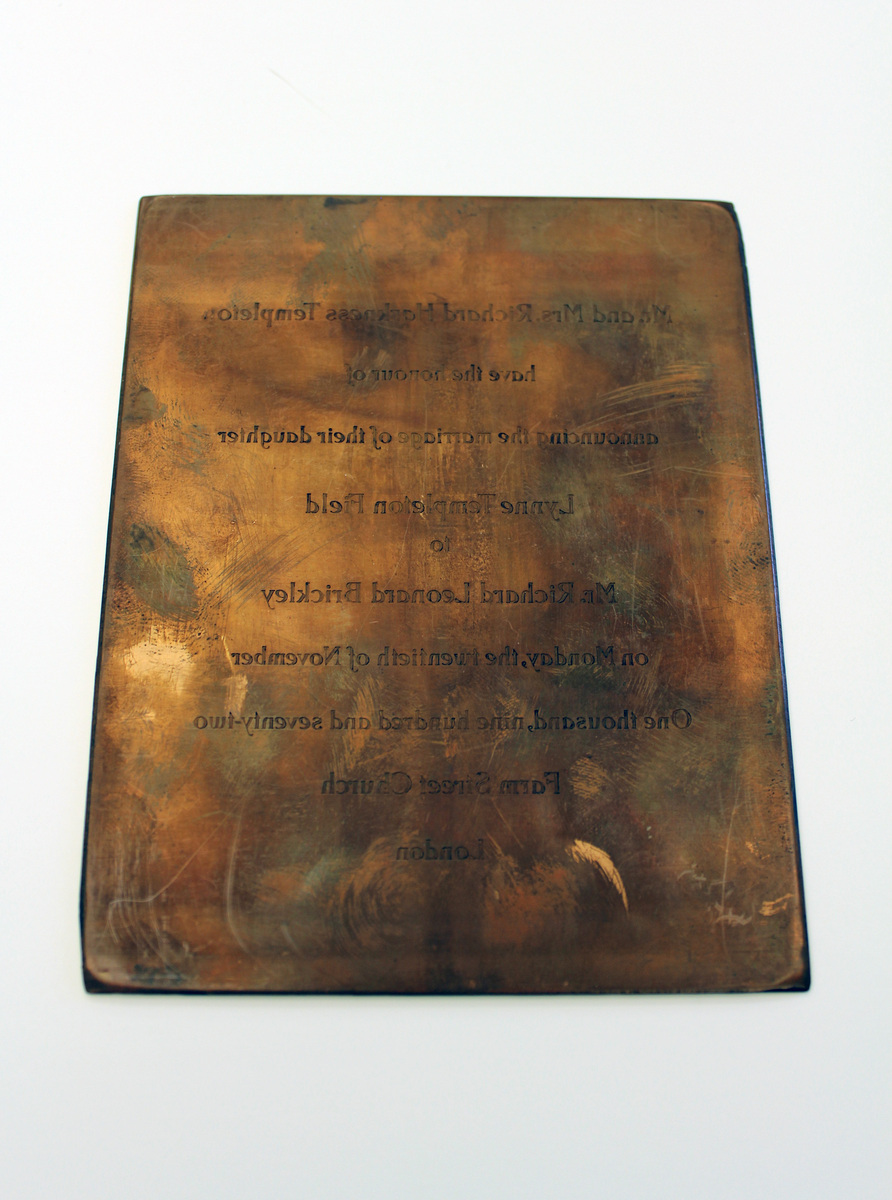 Copper plate used for printing. Engraved or etched lettering on one side (reversed), "Mr. and Mrs. Richard Harkness Templeton/have the honor of/announcing the marriage of their daughter/Lynne Templeton Field/to/Mr. Richard Leonard Brickley/on Monday, the twentieth of November/One thousand nine hundred and seventy-two/Farm Street Church/London."