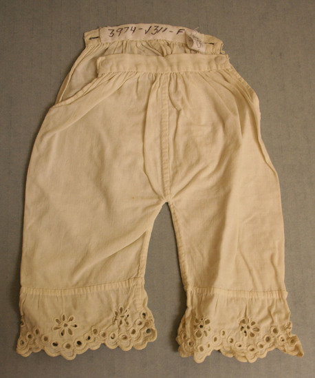 White cotton doll's pantaloons with eyelet embroidered leg cuffs. Side vents at waist with small glass buttons. Gathered at waist.