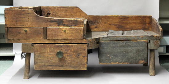 Wooden cobbler's bench with leather seat on one end, heavy drawers underneath, and cubby-holes on other end. Brass knobs on drawers.