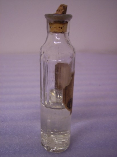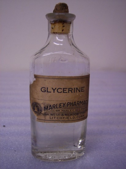 Clear glass bottle with cork stopper, filled 1/2 withclear thick liquid. Rectangular white paper label pasted on front printed in blue ink "GLYCERINE / MARLEY PHARMACY / WM MARLEY, REG PHARM. / Cor West & Meadow Streets / Litchfield, Conn."