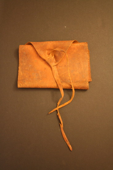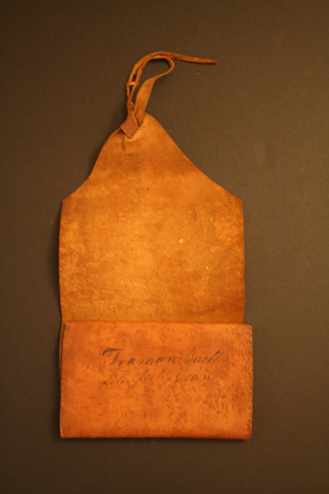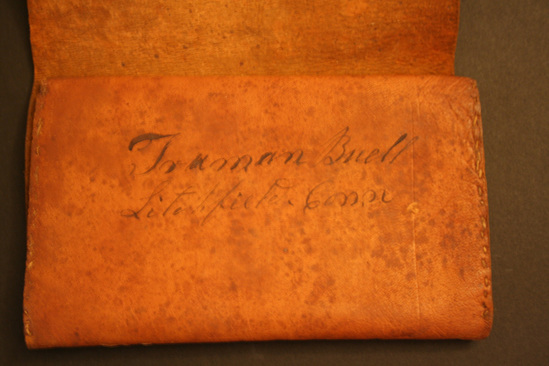 Man's leather wallet or billfold. Brown leather. Folds over on itself three times. Single pocket at end. Stitched closed on sides with linen thread. On backside of pocket in ink "Truman Buell/Litchfield, Conn." End of bill fold comes to a poitn with two thin leather ties to wrap around body of wallet and close. Small loop stitched onto back of wallet possibly to run belt through?