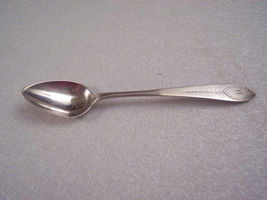 Silver teaspoon. "Wm THOMSON" imprssed into back of spooon handle in shaped rectangle. Etched at bottom of handle on front is letter "M" in oval with pendant swag on handle. Spoon is Ensho 1790 shape with arrow shaped tab joint.