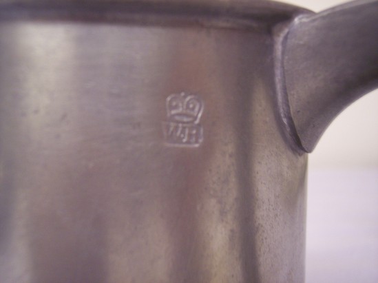 Ear shaped handle, cast reeded base, plain sides, thin lip rim, plain handle, touch inside. 1779 scratched on base. Mark on bottom - bird and lamp with "Townsend" above and "Crompton" below, crown and "WR"