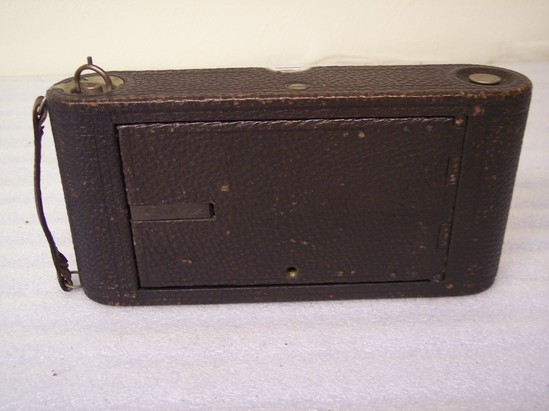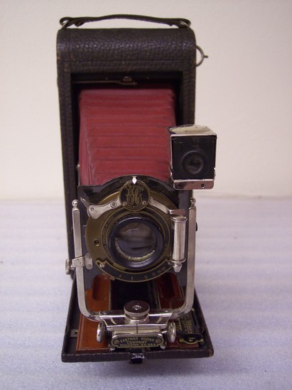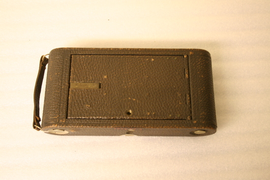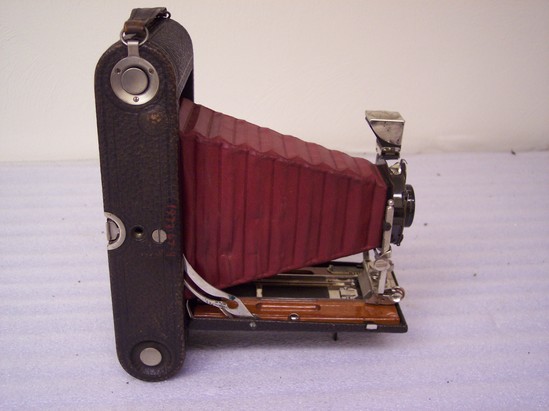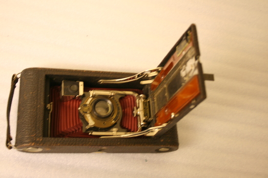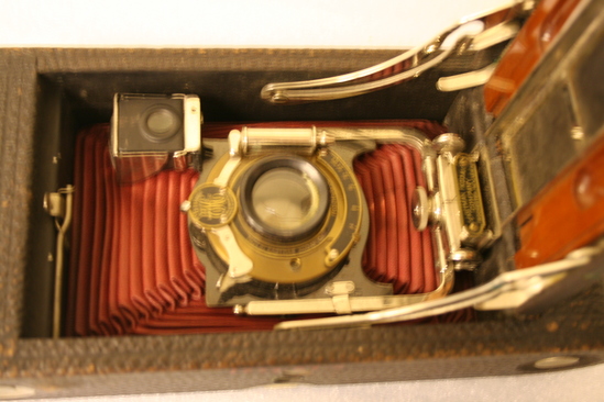 Folding camera - collapses into brown leather covered case. Lens apparatus for adjusting focus is nickle plated, runners are mounted on wood. Distance guage is marked in feet and meters. Bellows made of leather which is stained a red color (cordovan)