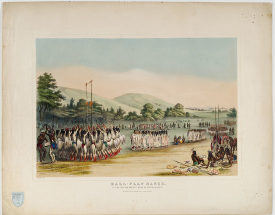 Printed in New York City by Currier & Ives 152 Nassau St. New York City, NY after the original painting by George Catlin. Pictures the ceremony of erecting the goal posts prior to a match. Two teams of Native American men stand around holding their sticks. Groups of Native American women are in rows facing each other. Team standing on the rigth has their bodies painted white.