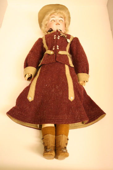 Doll has bisque head and composition body. Eyes that close when doll is laid on her back. Doll dressed in purple wool suit - skirt and jacket. Cotton blouse and socks. High button leather shoes. Hair dressed high on head with top knot on which is hat of wool material to match suit. Doll has two holes in back of neck. Arms and legs are joined.