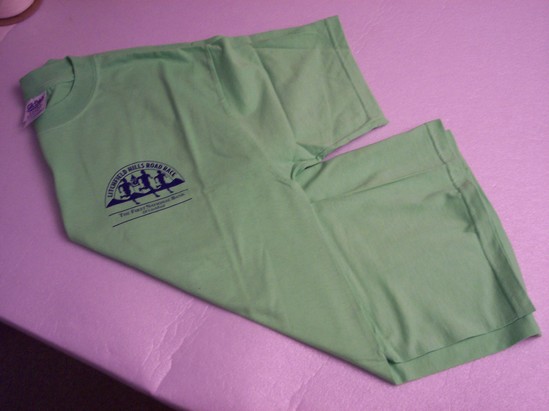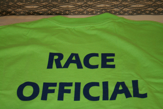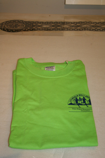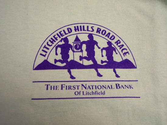 Lime green short sleeve T-shirt. Printed in navy blue on left front of shirt is logo. Arch with "Litchfield Hills Road Race" printed inside arch. Three runners under arch with tower or steeple in background. Underneath logo "The First National Bank of Litchfield" printed. "Race Official" printed on back in large block lettering, navy blue in color.