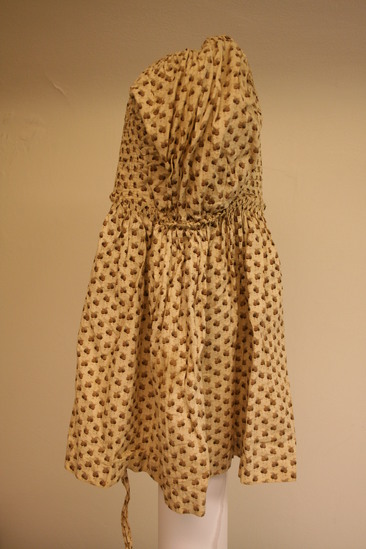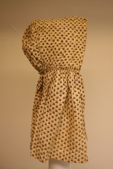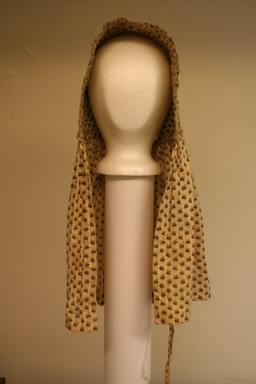 Cotton bonnet in tan fabric with small brown acron like design printed on ground. Attached along bottom is a very long piece of matching fabric - a bavolet. One tie of matching fabric on right side.