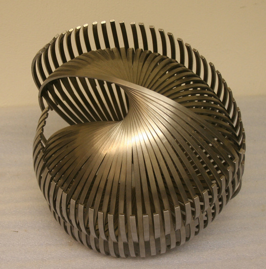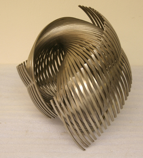 Interlocking curved stainless steel wire sculpture. Thin vertical pieces of steel woven and curved together to create a spiraled ball shape. Signed "11-100 c Erwin Hauer"