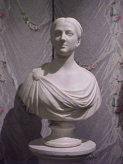White marble bust of Margaretta Dotterer Perkins with her hair parted in the middle and gathered in a bun in the back, with carved ribbon holding in place - upper body draped in a toga with obal brooch at the left having Roma on it in a fancy border. Grey marble column with white base and top stand.