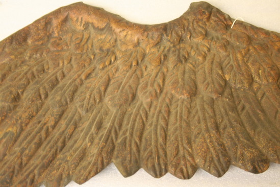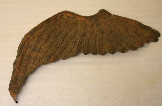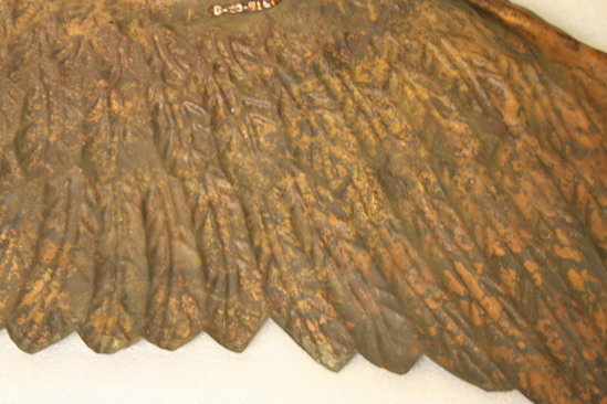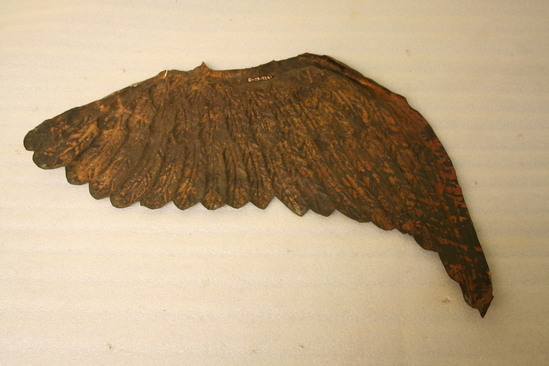 Wing of a bird from a weathervane. Molded tin with copper and gilt wash on outside. Char and burn markes around edges.