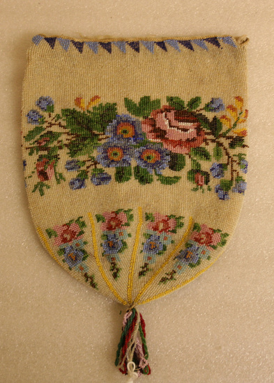 Beaded purse. Beads sewn onto white net base. Purse lined with white silk. Beaded design has white beaded background with large floral design in center. Border along top of two shades of blue triangles and small clusters of flowers between yellow lines at bottom of purse. Loops of colored beads at center bottom of purse. Drawstring at top missing.
